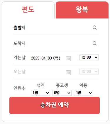 - 출발지, 도착지, 날짜 선택