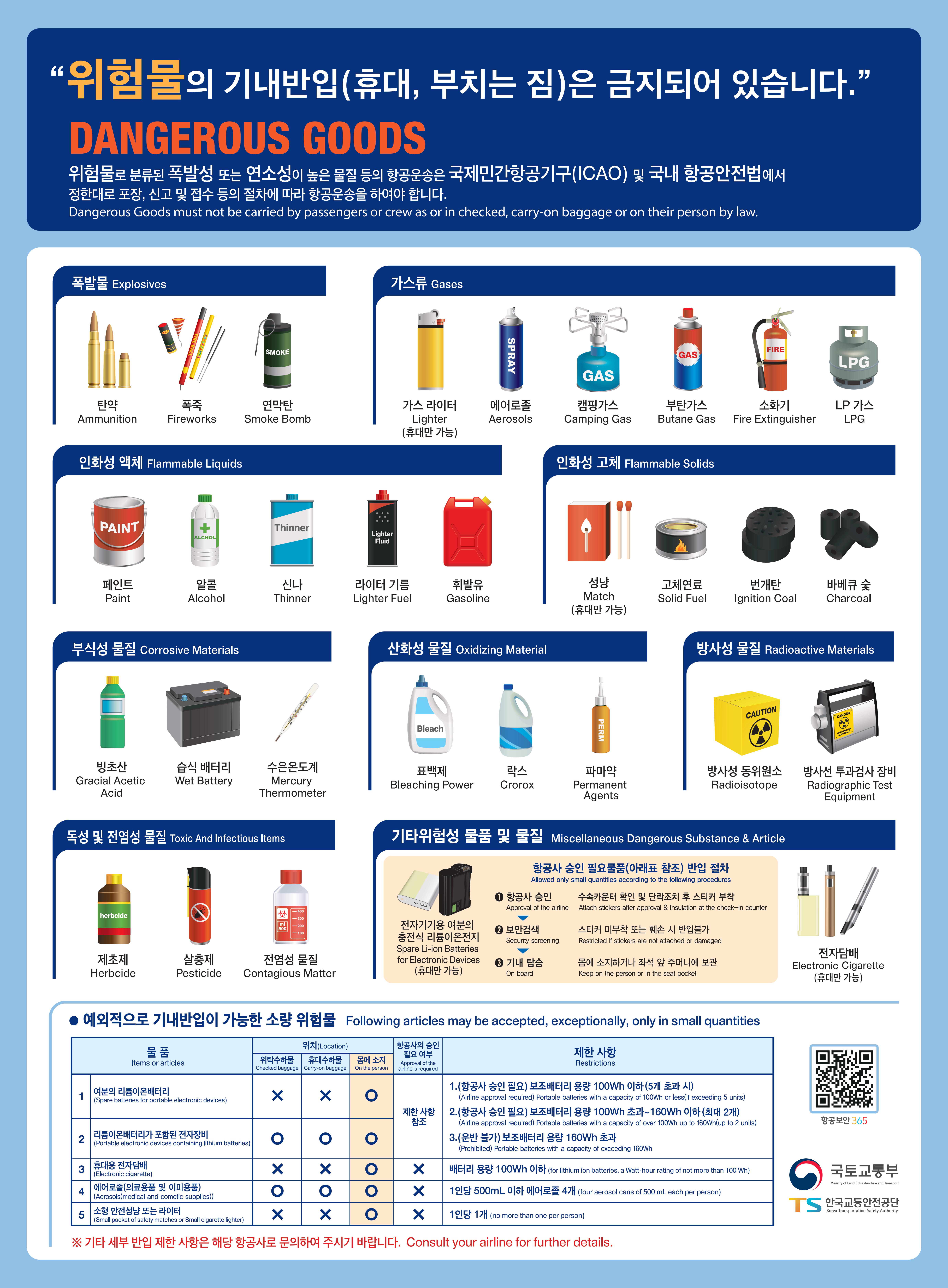 - 고압가스, 인화성 물질, 폭죽류는 위탁·기내 모두 금지